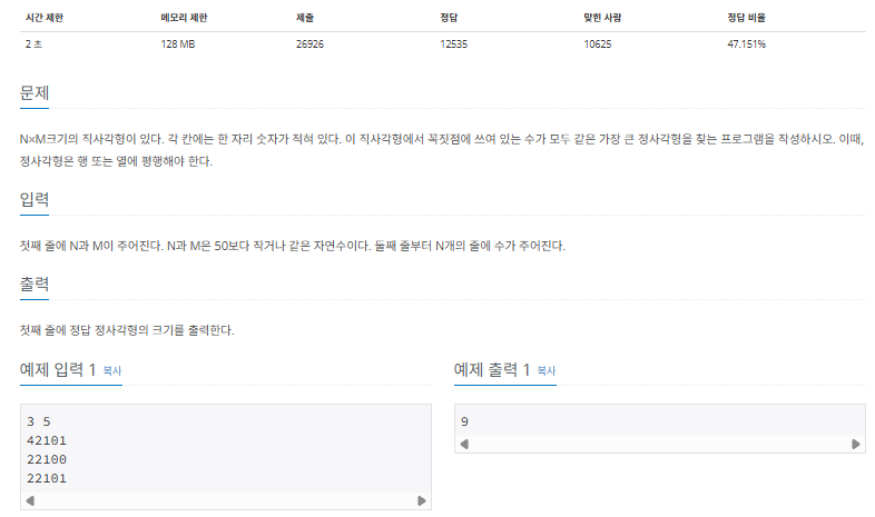 [JAVA] 백준 숫자 정사각형 1051 본문